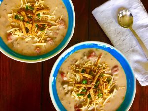 This hearty dish has all the flavors of loaded nachos in a creamy delicious soup. You can vary the ingredients to make it your own and add whatever you normally enjoy with regular nachos down to adding salsa or even sour cream on top. To make this soup vegetarian, simply substitute canned pinto beans for … Continue reading Loaded Nacho Soup